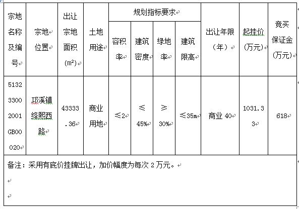 經紅原縣人民政府批準,受 紅原縣國土資源局委托,對紅原縣邛溪鎮絳熙西路(地塊編號:513233002001GB00020)國有建設用地使用權 依法進行公開掛牌出讓。現將有關事項公告如下: