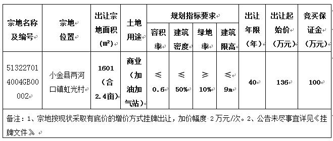 經小金縣人民政府批準,受小金縣自然資源局委托,對小金縣兩河口鎮虹光村“513227014004GB00002”號地塊國有建設用地使用權依法進行公開掛牌出讓。現將有關事項公告如下: