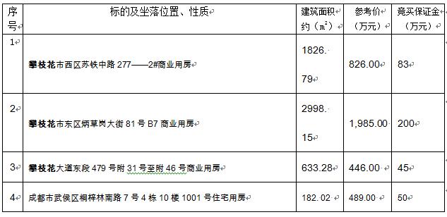 受委托,我公司將于2023年5月31 日15:00在我公司會議室(成都市錦江區(qū)畢升路468號創(chuàng)世紀(jì)廣場31樓)對以下房產(chǎn)按標(biāo)的現(xiàn)狀進行公開拍賣,現(xiàn)將拍賣相關(guān)事宜公告如下: