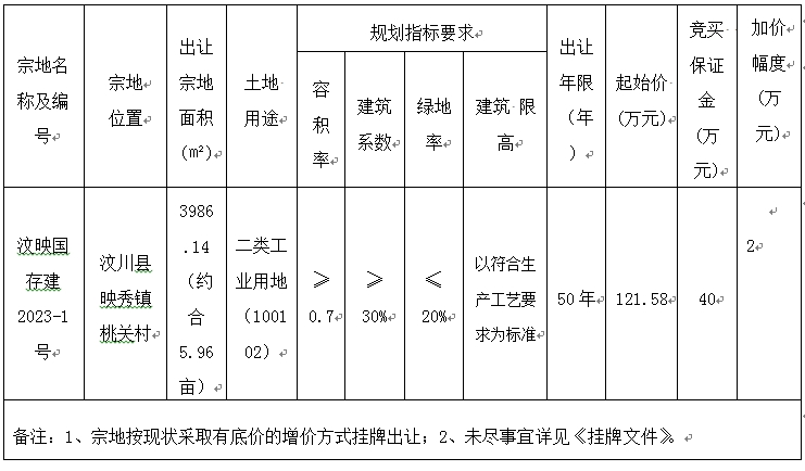經汶川縣人民政府批準,受汶川縣自然資源局委托,對汶映國存建2023-1號宗地依法進行公開掛牌出讓。現將有關事項公告如下:
